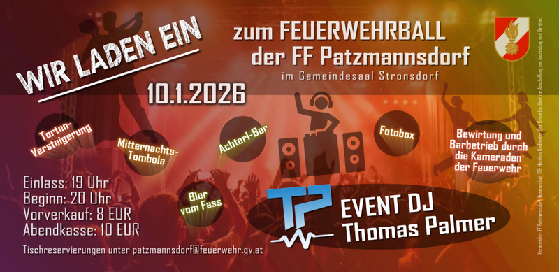 Der Kartenvorverkauf für den Ball der FF Patzmannsdorf am 11.01.25 hat begonnen – Tischreservierungen sind bereits möglich!